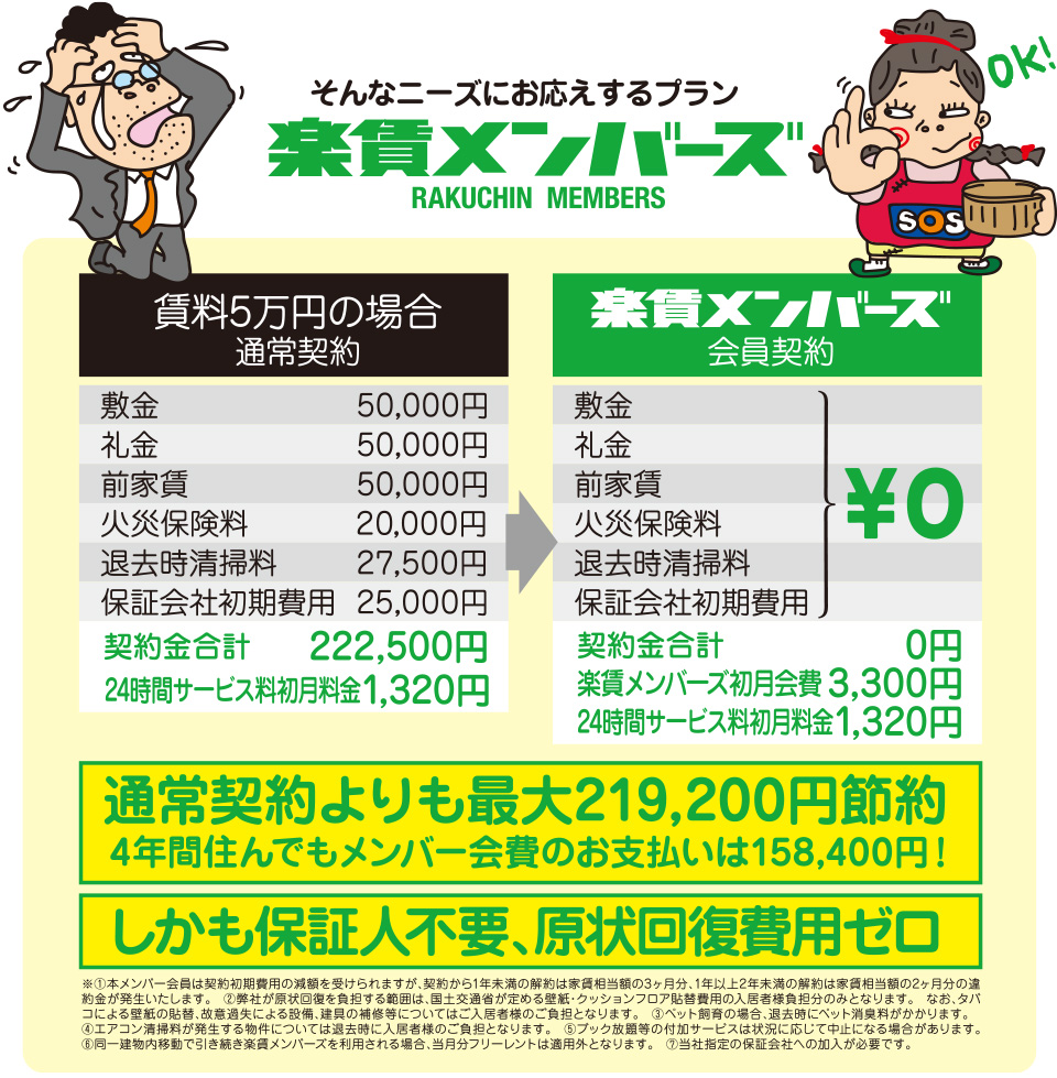 ①本メンバー会員は契約初期費用の減額を受けられますが、契約から1年未満の解約は家賃相当額の3ヶ月分、1年以上2年未満の解約は家賃相当額の2ヶ月分の違約金が発生いたします。